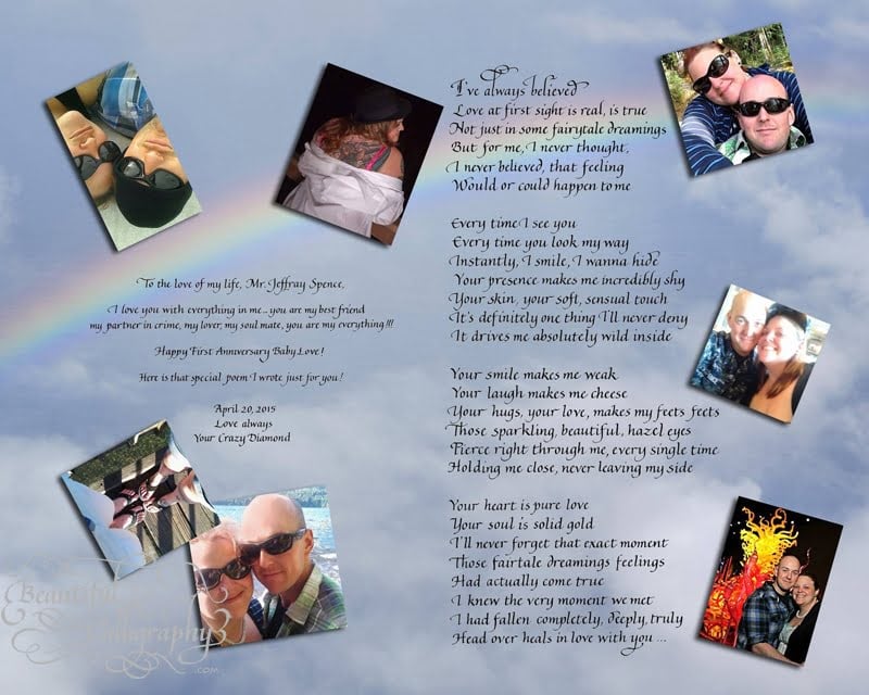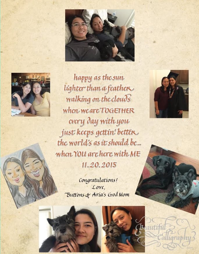 Another great way to find text that really speaks from your heart for a best friends gift is to go a card store and read greeting cards. Sure, some of them are sappy, but there are some really wonderful texts that can inspire you to write a heartfelt gift for your best friend. Take some pictures of the texts you like to give you ideas for your friend’s gift. When it’s written in calligraphy combined with your photographs, it becomes a truly memorable gift that your friend and you will treasure. In fact, we can make 2 (the second print costs less!).