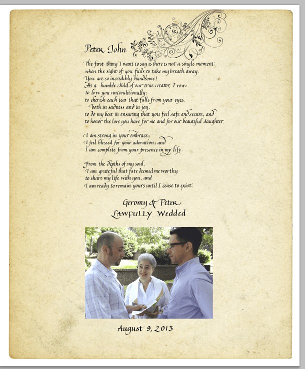 Do you have a first song, a favorite love poem? ~ Any of these can be used to make a beautiful calligraphy anniversary gift for your spouse. I am also “Gay Friendly” – love is love! So feel free to bring me your love poems to bring those visible words of love into your home- or office!