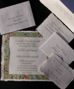 Here's an example of an invitation that is done in my calligraphy. I first wrote the calligraphy, edited it with photoshop, and then sized it for the different size pieces. It was sent to a printer, and printed in the color the bride chose. This can be done on any invitation that you like- instead of using a computer font, you can have a custom invitation done with calligraphy. Then I can address the envelopes for you, so it will be a totally custom invitation.